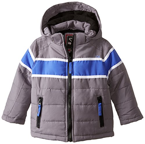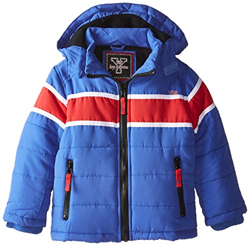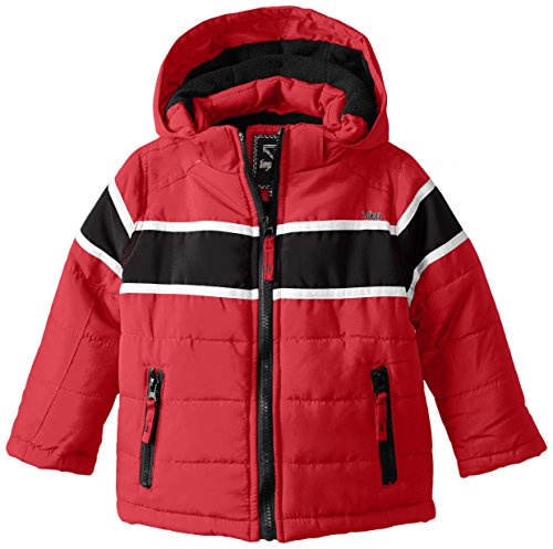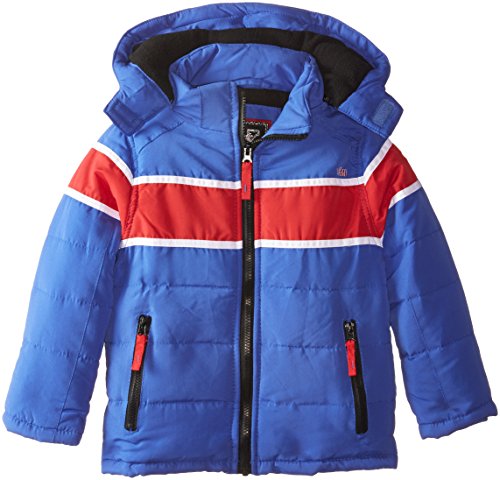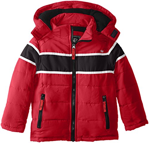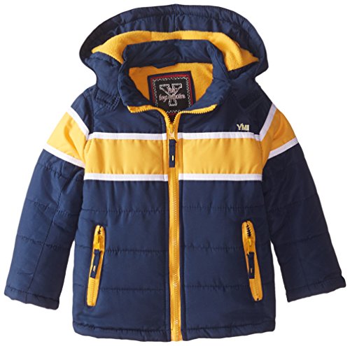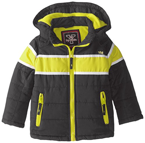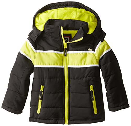YMI Little Boys' Bubble Jacket with Contrasting Horizontal Racing Stripe and Detachable Hood, Black, 7