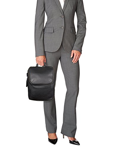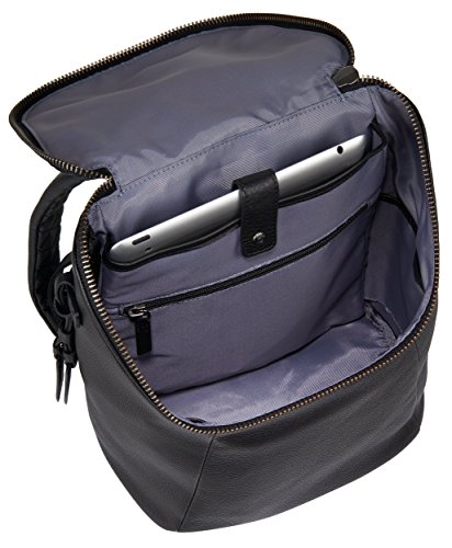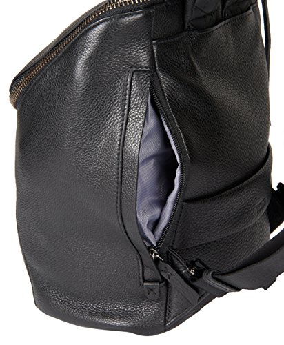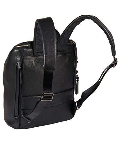 Exterior features, leather top handle, padded backpack straps, single zip entry to main compartment with zipper pull. Vertical back zip pocket add-a-bag strap on back logo embossed dangler