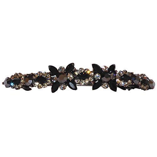 Binding : Misc. Product Description Swarovski Crystal Barrette Marcasite measuring 4.5" long by .7" tall with a 3 inch curved automatic barrette clip. The focal point of this barrette are two large clusters with four black marquis cut crystals surrounding a large round black crystal. In between the two large clusters, there is an oblong cluster with a black marquis crystal in the center and surrounded by smaller gray crystals. Interspersed in the design are smaller gray round crystals, large round black crystals and marquis cut black crystals. 0
