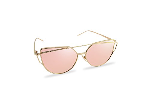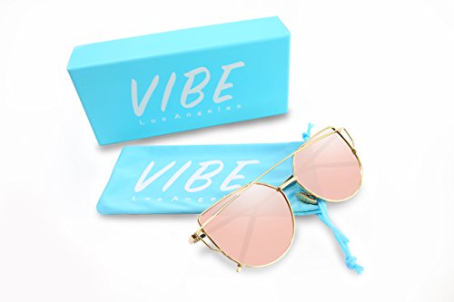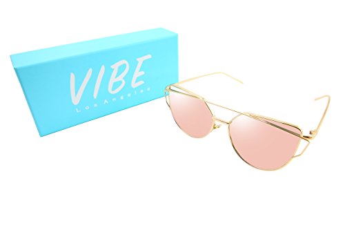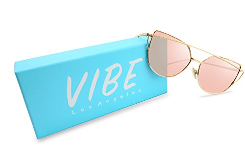 Vibe LA Cat Eye Flat Reflective Flash Lenses Metal Frame Women Sunglasses (Gold, Pink)
