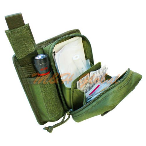 -. Feature : EMT universal first aid kit / Color: OD GREEN / Molle compatible easy access 2-way zippered pouch ; Opens to a divided main compartment / Item comes with:povidone iodine prep pads;sterile gauze pad;flashlight;bandage;aspirin tablets / Quantity: 1 ; Weight: .80 lbs