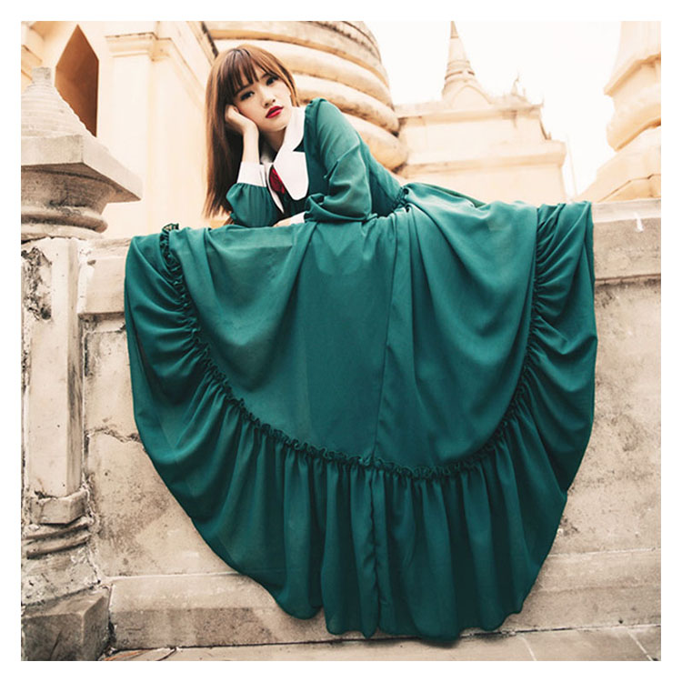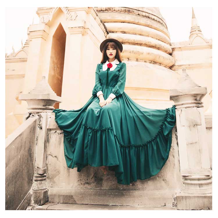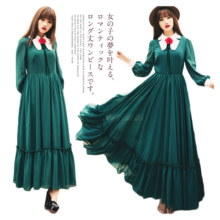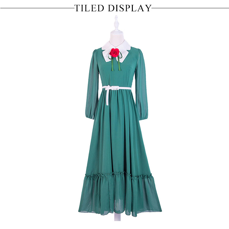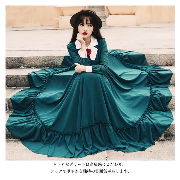 | 女の子の夢を叶える、ロマンティックなロング丈ワンピースです。レトロなグリーンは高級感にこだわり、シックで華やかな独特の雰囲気があります。ローズ、配色衿やロング丈のフレアシルエット、大人可愛いドレッシーな雰囲気を醸します。ハロウィン仮装にはもちろん、テーマパークへ、街へ、パーティーへ、発表会の衣装にもぴったりです。 | |