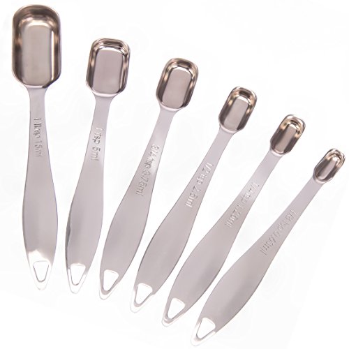 - STAINLESS STEEL MEASURING SPOONS with Engraved Markings. Made of Highly Satin Brushed, Heavy Duty, Food Grade Stainless Steel. Manufactured in One Piece, Long and Slim Design to Easily go into Most Narrow Spice Jars. Standard US and Metric Size Markings on the Handles Ensures Accurate Measuring. Very Durable and Elegant.