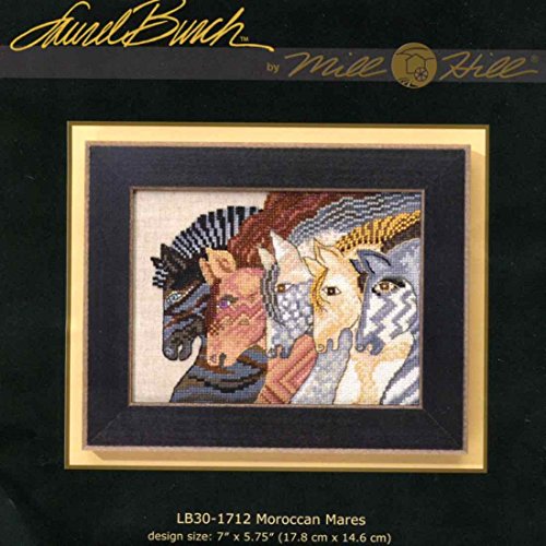 Moroccan Mares, a Laurel Burch abstract design beautifully rendered in vivid color, contains all materials needed to complete the stitched piece: Mill Hill Glass Beads, Wichelt Permin 28 Count Natural Linen, and floss