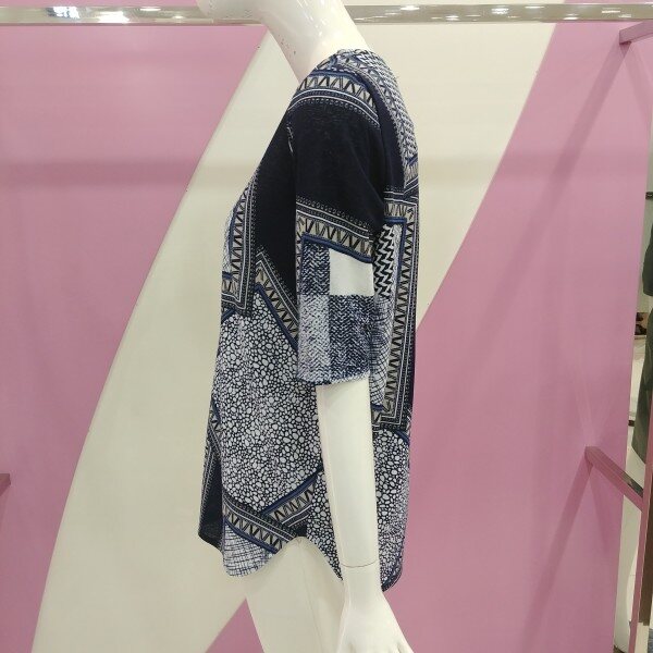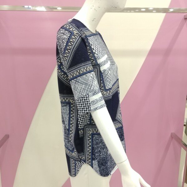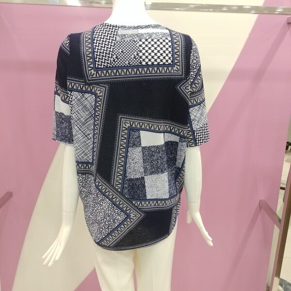 폴리재질로 부드럽게 착용 가능하며, 기하학 무늬로 더 고급스럽게 표현한 블라우스.정사이즈 구매.