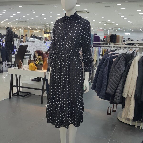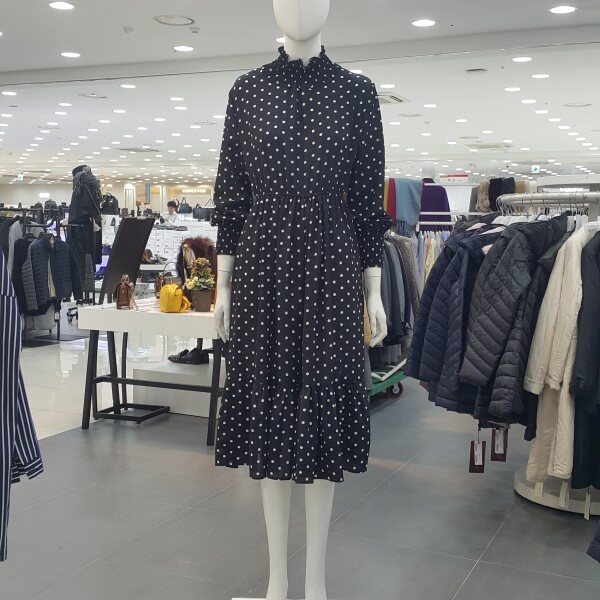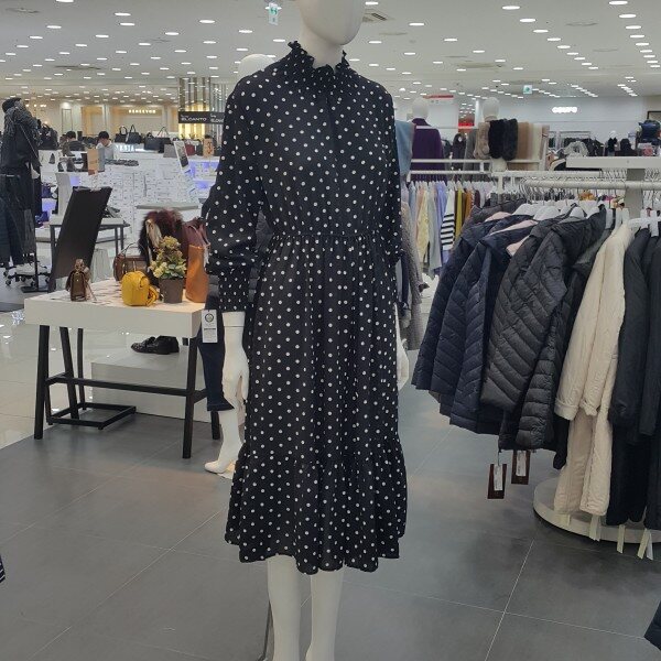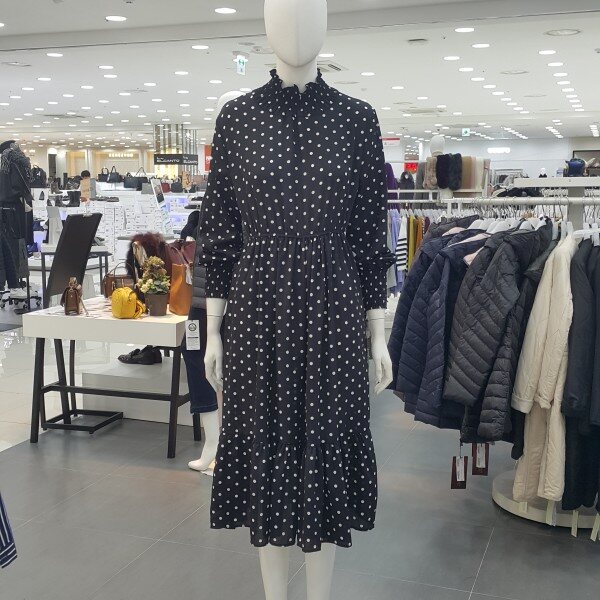 전체땡땡이나염에 네크라인과소매밴딩으로포인트되는원피스입니다