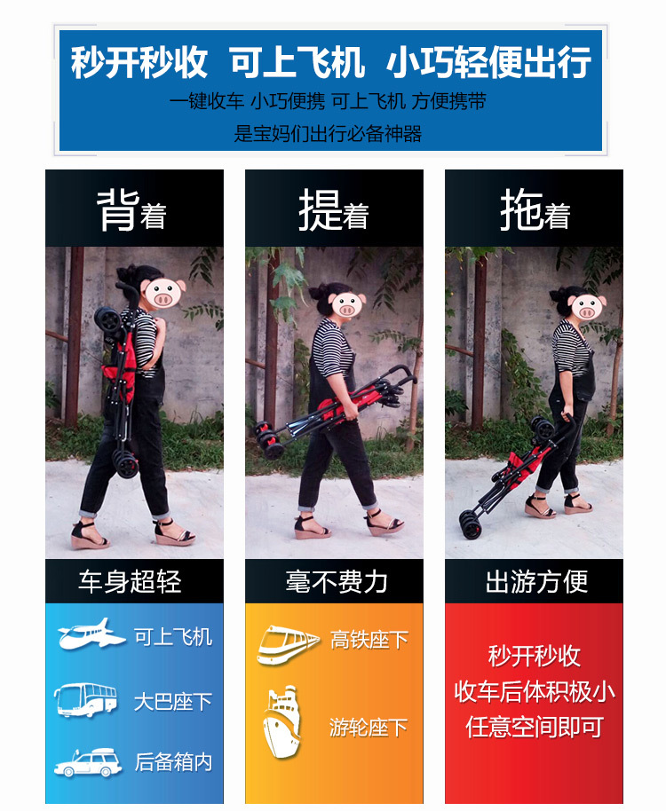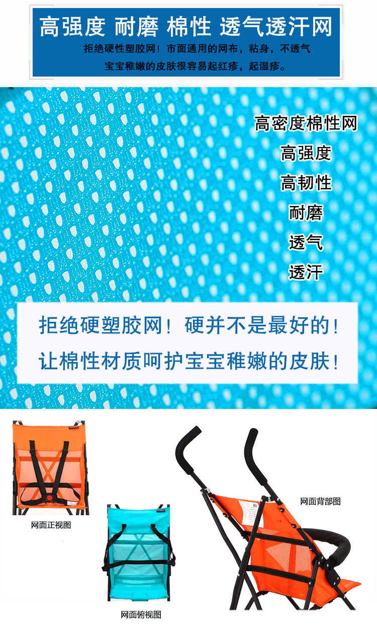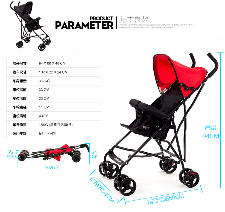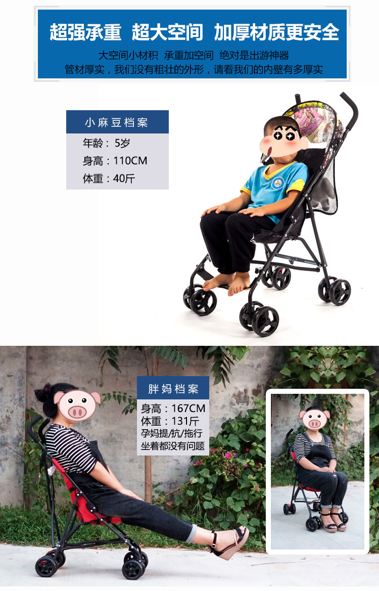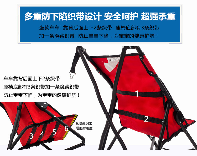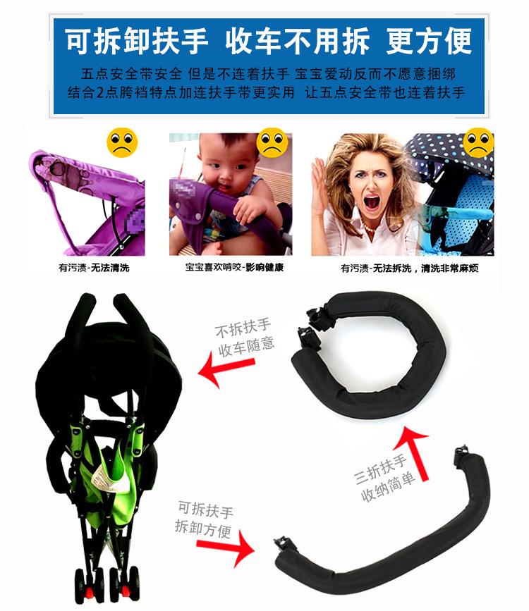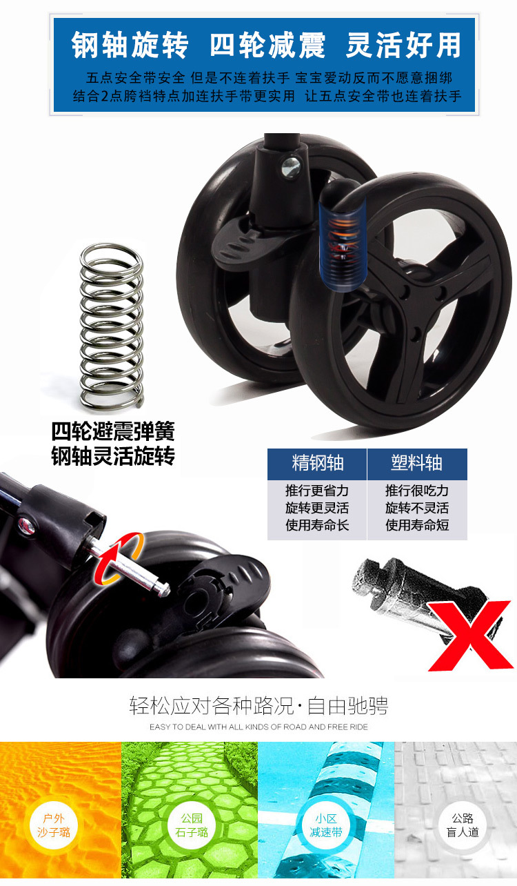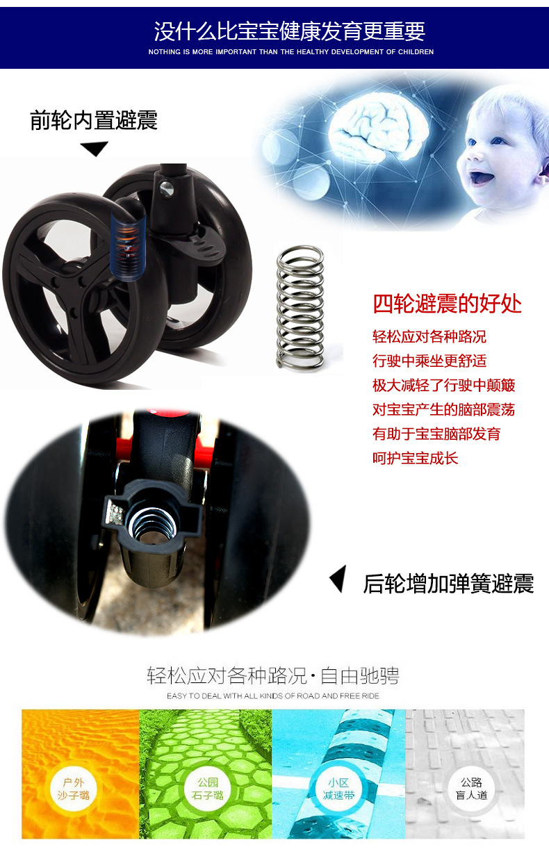 特点:前轮万向定向,后轮刹车,四轮避震,前轮座为尼龙料+钢轴,耐磨灵活,保持长久旋转灵活,推行很轻松,管壁1.0厚,用料安全环保,喷砂哑光烤漆上档次,一键收车,便于折叠携带,极省空间,背部高强度棉性网布,贴身舒适,透气吸汗,顶蓬可拆卸,五点安全带,宝宝围挡前护栏可拆卸,宝宝上下车方便,便于清洗。