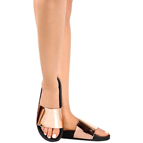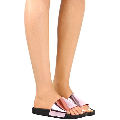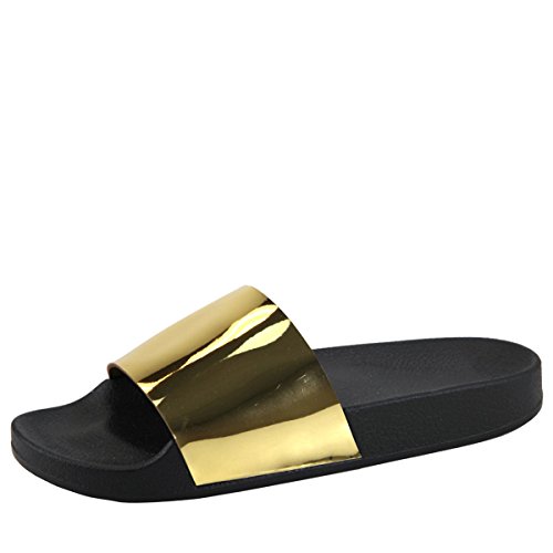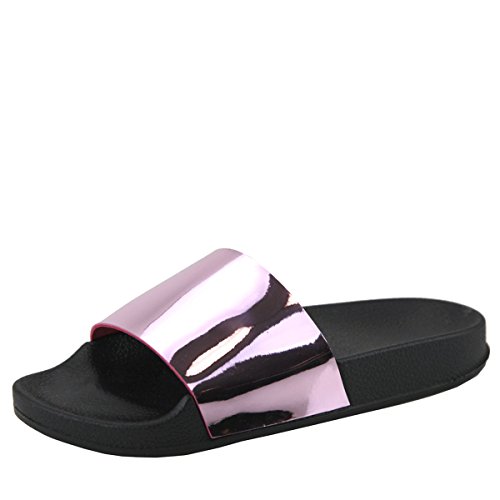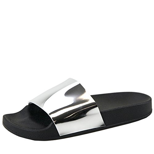 Binding : Apparel Product Description Introducing a slide you won't be able to take your eyes off! Team them with relaxed denim-cami-combo, and watch your look become cooler in a hot second before your eyes! This slide sandal feature an open toe silhouette, wide metallic single band across vamp, easy slip-on construction, and a comfy molded foot-bed 0