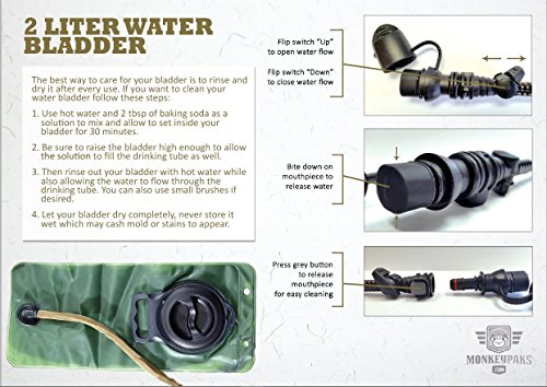 - Feature : SIP WITHOUT STOPPING * Hydration backpack water bladder lets you easily sip on the go with a removable 2.5L large mouth BPA free bladder. / STOW GEAR FOR YOUR 3-DAY EXCURSION * US Army style backpack has a huge capacity plus a ton of MOLLE webbing for all your gear requirments. / 3 MOLLE ATTACHMENTS INCLUDED. Organzie All Your Gear In Different Pouches or Bag / MADE FOR THE TOUGHEST OF TERRAINS * Tactical backpack made of 600D strong nylon & heavy duty big teeth zippers with paracord to keep them quiet. / ANOTHER HIGH QUALITY MILITARY STYLE BACKPACK FROM MONKEY PAKS *We offer a 100% full love it or return it guarantee, our outstanding customer service is our number one goal.