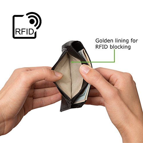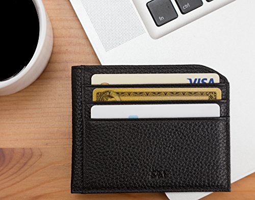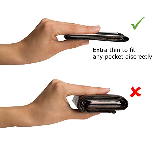 -. Feature : PRACTICAL & SLIM, it is suitable to be carried in your pocket without creating a bulky aspect, sizing 3.4" X 4.1" X 0.1'" / PREMIUM QUALITY WITH A MODERN DESIGN, it is made from genuine cow leather and has a comfortable and smooth feel / CONVENIENT ACCESS & PLENTY OF SPACE, it holds up to 6 cards, it has 1 transparent ID window with thumb push access and 1 cash compartment. The cash compartment has a wider opening than regular card wallets offering easier access to your bills. / RFID BLOCKING, our wallets protect your cards and valuables from electronic pick-pocketing and theft. The signal from ID and access badges operates on a different frequency and will not be blocked by this wallet. / DEPENDABLE & PERFECT FOR ALL genders and ages, an exceptional wallet cut out for everyone; It makes a WONDERFUL GIFT as our wallets come with a matching black leather key ring and a reusable black elegant gift box