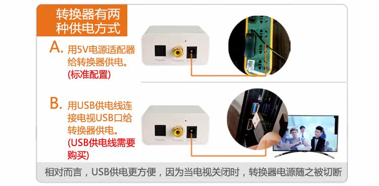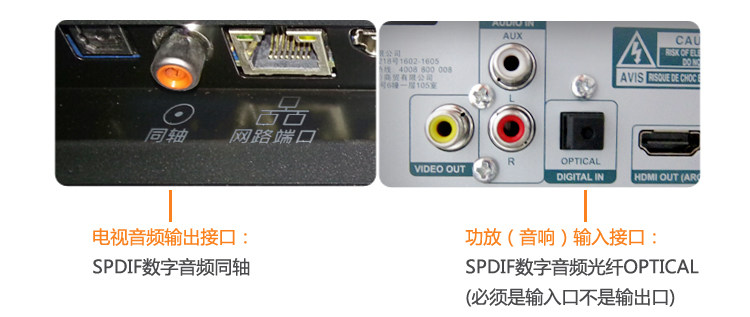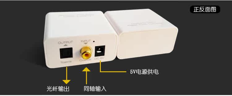 下面是光纤转同轴转换器,电视是光纤输出,音响功放等是同轴输入,请点
