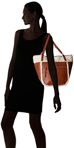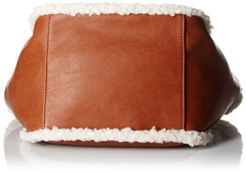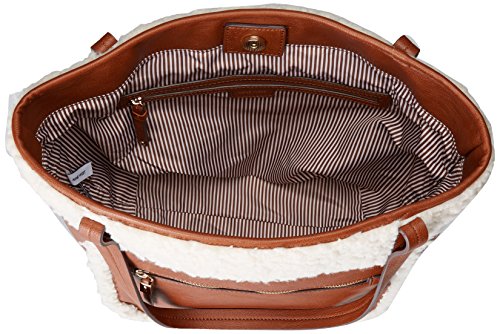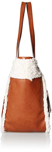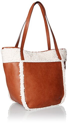 Faux-leather tote bag featuring faux-fur overlays and striped lining