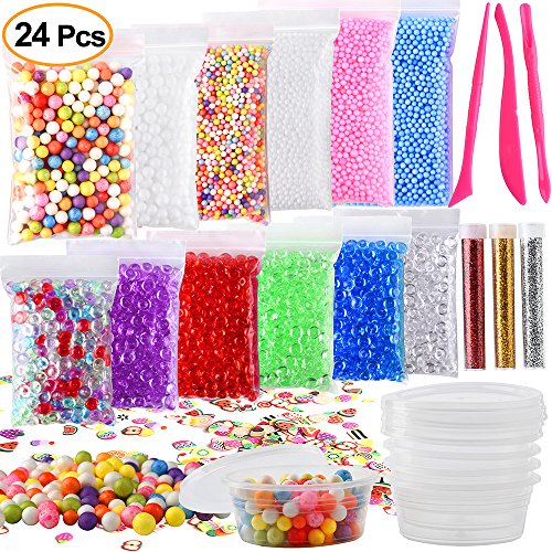 Kuuqa 24 Pack Slime Making Kit Supplies Including Micro Foam Beads Styrofoam Balls Fishbowl Beads Confetti Fruit Slices Slime Tools for DIY Craft