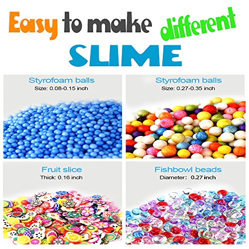 - Package contain: 6 pack fishbowl beads, 6 pack styrofoam beads, 3 pack confetti, 5 slime storage bowls, 3 slime tools, and one fruit slices (mixed)