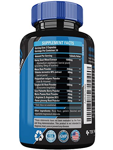 Horny Goat Weed Extract 1000 mg, Maca Root Powder 250mg, Tribulus Terrestris 40% Extract (aerial parts) 60mg, Polypodium Vulgare Powder 20mg, Tongkat Ali Root Powder 100mg, Saw Palmetto Berry Powder 100mg, Muira Puama Root Powder 20mg, L-Arginine (L-Arginene HCL) 20mg, Panax Ginseng Root Powder 20mg.