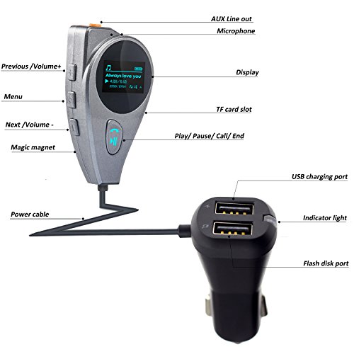 Bluetooth FM Transmitter, Wireless In-Car FM Transmitter Radio Adapter Car Kit with Dual 5V/2.1A USB Car Charger, AUX Port Support TF Card USB Flash Drive - Magnetic Car Mount holder