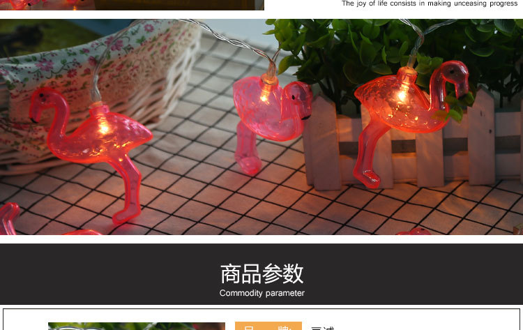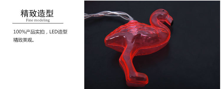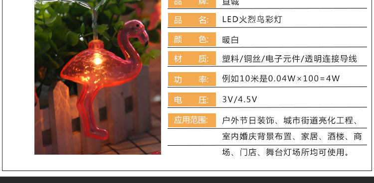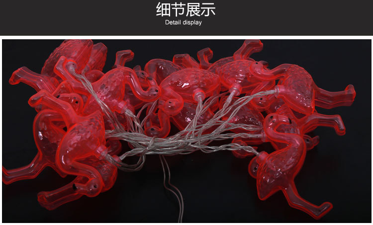 参数:10个火烈鸟每套,灯距15CM,总长1.5M,2AA常亮电池盒(自备两节五号电池)。