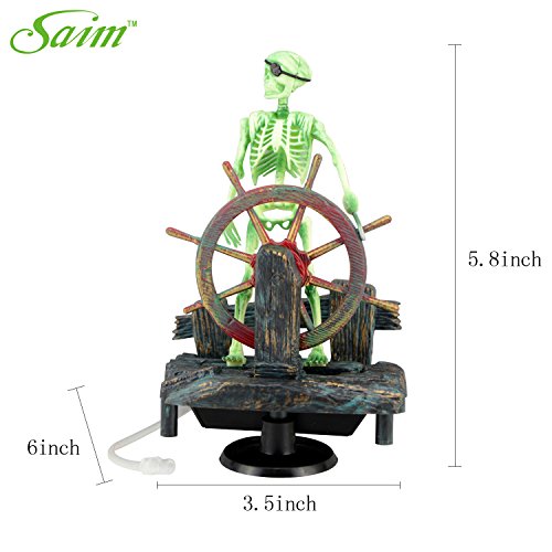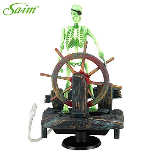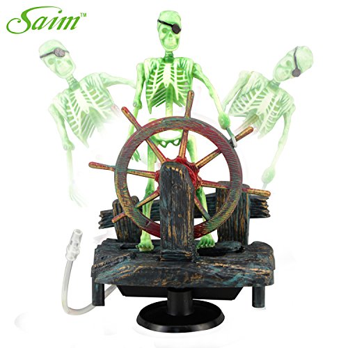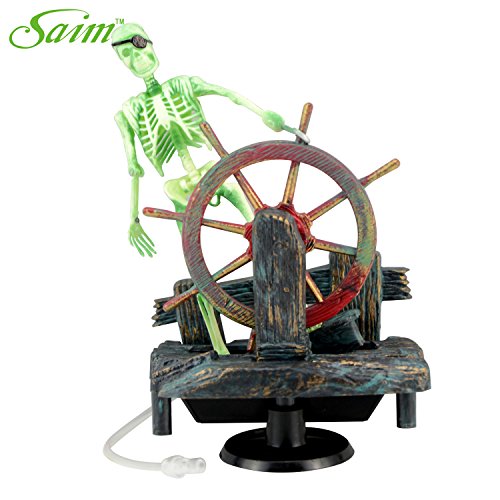 -. Feature : Real motion air-driven ornamenink while guarding his treasure chest.ts provide entertaining action while aerating your tank. / Pirate skeleton steers the remains of his sunken ship. / Requires air pump & tubing.