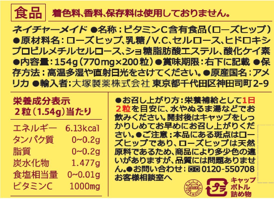 原材料 : ローズヒップ、乳頭/ビタミンC、セルロース、ヒドロキシプロピルメチルセルロース、ショ糖脂肪酸エステル、酸化ケイ素