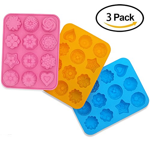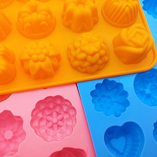 3 Packs Silicone Fondant Cake Molds, ANIN 12-Cavity Flower Shapes Non-Stick Kitchen Baking Pans Ice Cube Trays for Making Candy Chocolate Muffin Cupcake - Pink, Blue, Orange