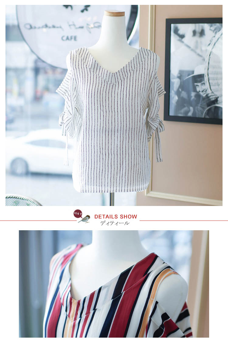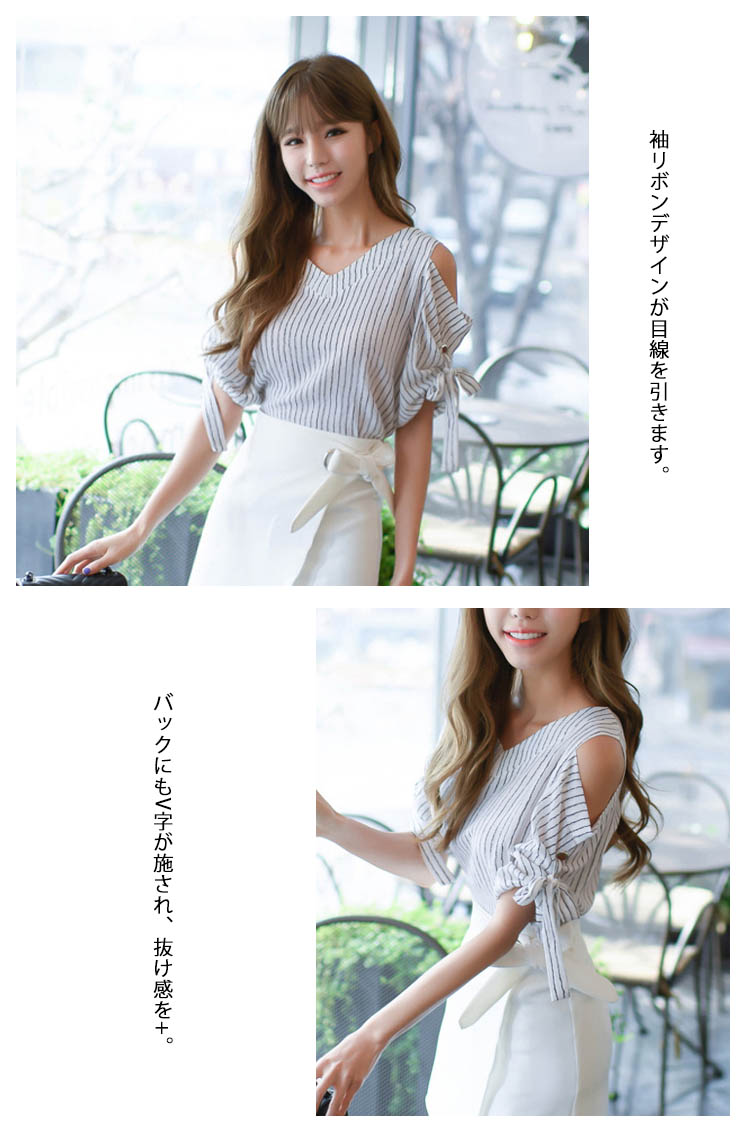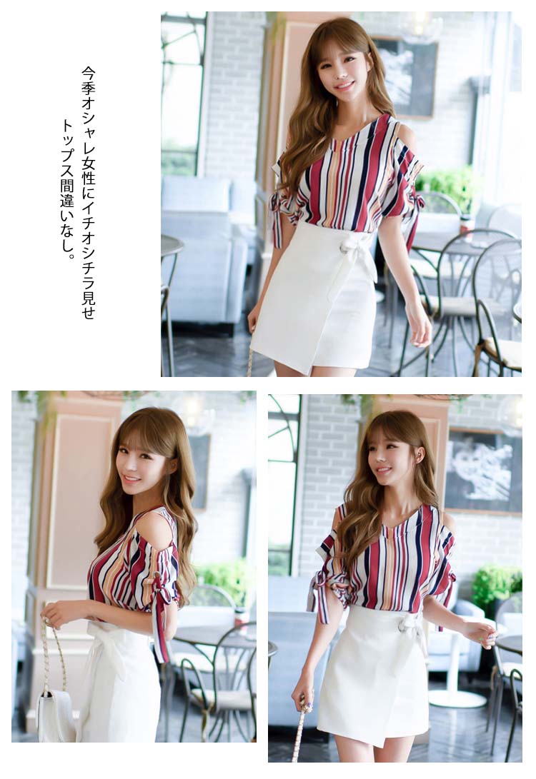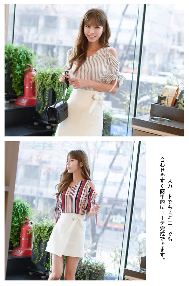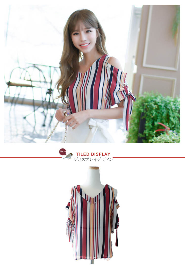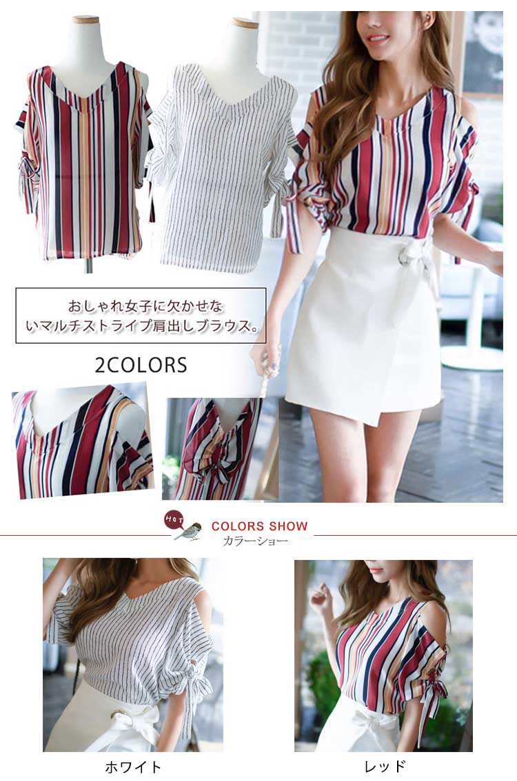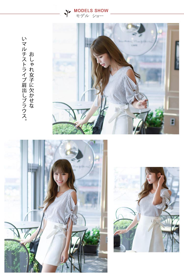 | おしゃれ女子に欠かせないマルチストライプ肩出しブラウス。袖リボンデザインが目線を引きます。バックにもV字が施され、抜け感を+。スカートでもスキニーでも合わせやすく簡単的にコーデ完成できます。今季オシャレ女性にイチオシチラ見せトップス間違いなし。 | |