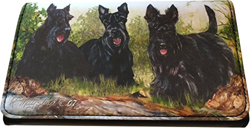 Binding : Apparel Product Description This beautiful Scottish Terrier wallet is designed by world famous animal artist, Ruth Maystead. Not only are you buying a wallet, but you are buying a piece of art. The wallet is 4 1/4 inches by 7 1/4 inches, will hold a check book, has plenty of room for credit cards, etc. and is made of naugahyde polyester fabric. It makes a wonderful gift. 0