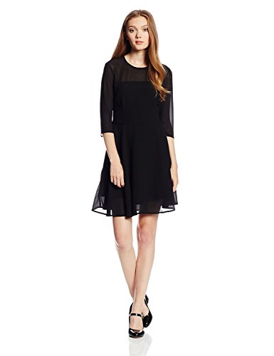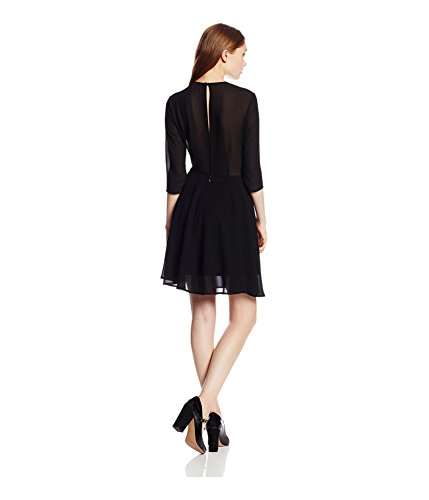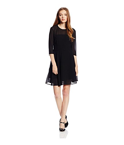 Product DescriptionThree-quarter sleeve fit-n-flare dress with sheer bodice and keyhole back detail. Partially lined. Hidden back zip closure. 35 inch length.0