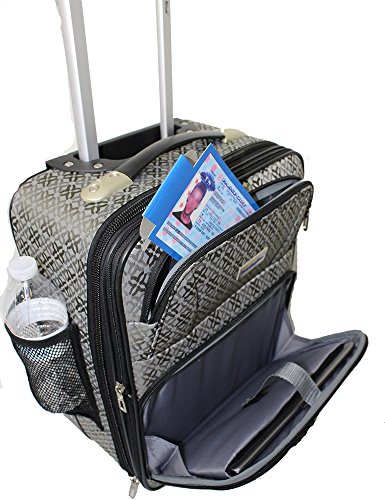 -. Feature : Size 18"13"8" under seat lage including wheels to meet the restrictions as personal item. / Custome Made of Fashion 1200D water-resistance fabric on in line skate wheels and push button telescopic handle / Multiple pockets for Ipad (9"7"), ticket, water bottle, and all travel accessories needed / Lightweight: 4.76 with capacity 20LB tested.