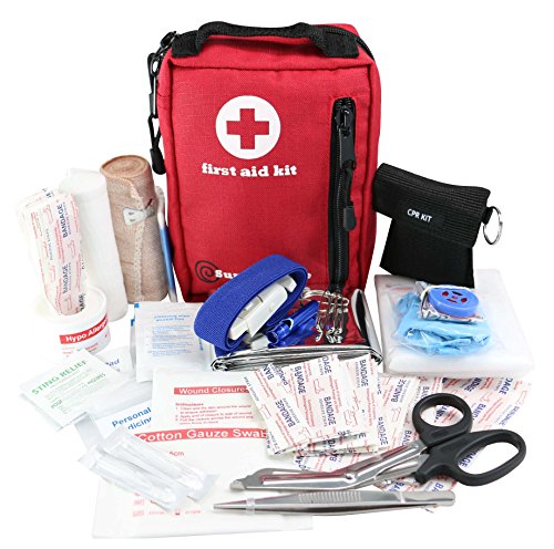 COMPACT, LIGHT AND PORTABLE. The kit comes with 100 essential basic lifesaving items while weighing only 1 pound. It measures 5.5 x 7.5x 3.5 inches and can fit into your car’s glove box. The MOLLE compatible straps on the back allow the user to wear it on other bags or your belt. Take it with you on road trips, hiking backpacking, camping, traveling or keep your own safe at home, school or the workplace. Water resistant bag and water proof inner laminate bags protect all items against moisture