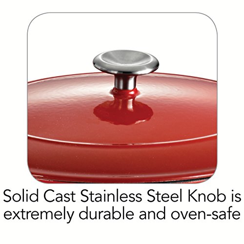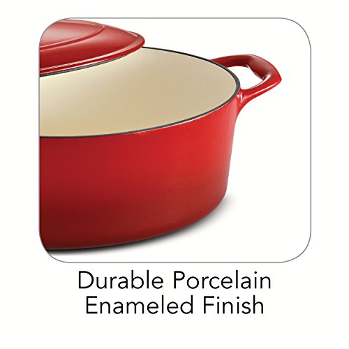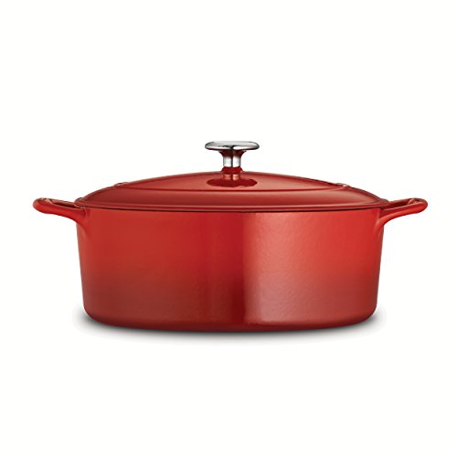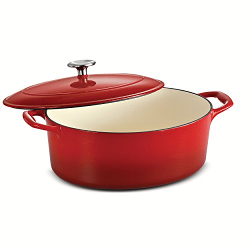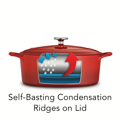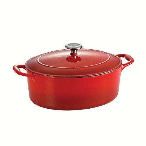 The enameled cast-iron 5.5 qt covered oval dutch oven is part of Tramontina's Gourmet collection of premium products engineered and manufactured with the finest design, materials and workmanship, outperforming similar products within the market and delivering the best quality and value to the cooking professional and enthusiast alike. Prized by cooks for heat retention and even cooking, this enameled cast-iron 5.5 qt covered oval dutch oven will deliver heat slowly so your braised pork chops and chicken-sausage chili serve up incredibly moist and flavorful, as the self-basting condensation ridges on lid uniformly collect and direct vapors onto food. The oval dutch oven also produces outstanding cobblers, Irish soda bread and baked desserts. Sturdy side handles make for secure lifting and transferring of the Tramontina enameled cast-iron dutch oven to your table. The heavy-gauge cast-iron covered oval dutch oven cooking surface is coated with off-white, smooth and easy-to-clean PFOA- and PTFE-free porcelain enamel. Offered in a vibrant, gradated porcelain enamel exterior finish for an elegant kitchen to table serving option. Hand-wash only, compatible with all cooktops and oven-safe to 450 F. This product is assembled and packaged in USA and offered under a lifetime warranty.Feature