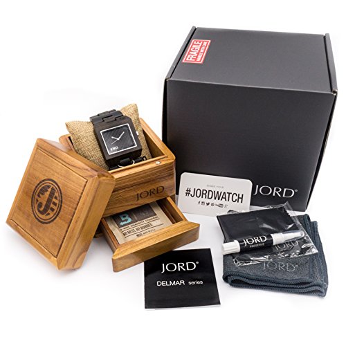 INCLUDED IN PACKAGE -- (1) Delmar Series Wood Watch with obsidian black carbon set in dark sandalwood. (1) Cedar Valet humidor watch box. (1) cleaning cloth (1) JORD Preserve citrus oil cleaning pen (1) instruction booklet and supplementary information (1) micro-fiber glass cleaning cloth (1) Retail JORD shipping box. FULL 1 YEAR FACTORY WARRANTY