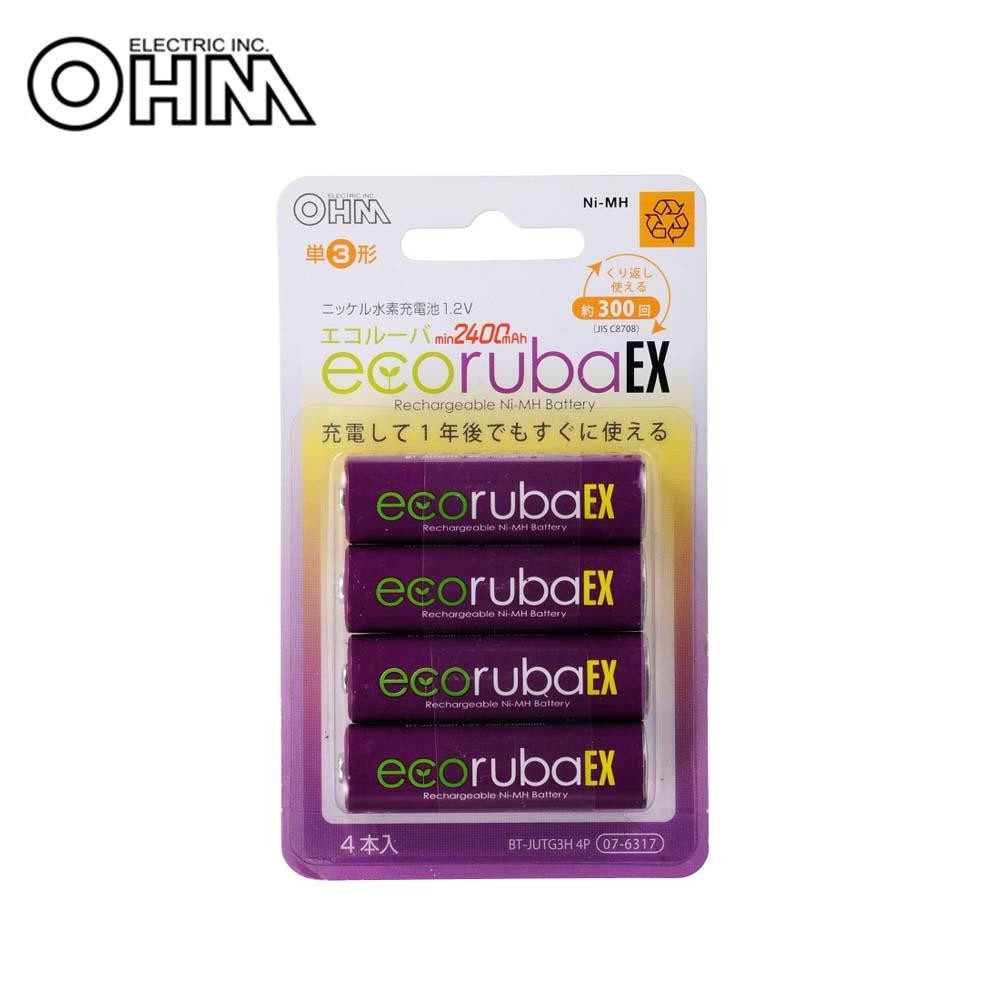 充電して一年後でもすぐに使えます。つぎ足し充電も可能です。 生産国:中国 ※サプライヤー直送品 ご注文後2~3営業日後の出荷となります【商品名】OHM エコルーバEX 充電式電池 単3×4本入 BT-JUTG3H 4P