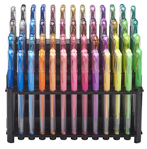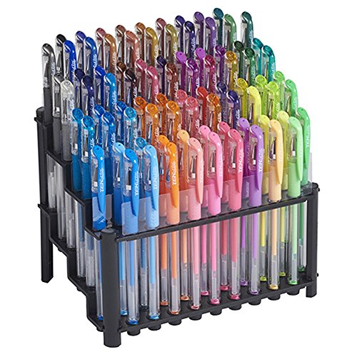 The 100-Count Gel Pens in Stadium Stand by ECR4Kids is ideal for coloring, scrapbooking, journaling, drawing, or anything else you are looking to create. Great for older kids and adults, pens are organized in a durable stadium stand to store and display on your arts and crafts table, office space, or classroom. The color assortment includes 70 unique colors in a variety of attractive ink types including -- basic, glitter, metallic, neon, neon glitter, silver glitter, and pastel. The gel pen tip sizes range from 0.7mm to 1.0mm and the check safe ink is fade and water resistant. All pens feature a durable pocket clip along with a latex free comfort grip for precision pen control. Fine tip pens with free-flowing ink that is acid-free, archival safe, water-based, non-toxic. Intended for use by ages 12 and up.Feature