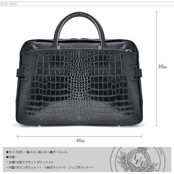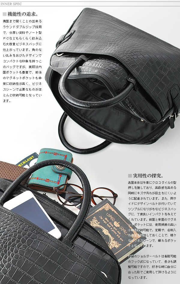 側面まで開くことの出来るラウンドダブルジップ採用で、分厚い資料やノート型PCなどもらくらく飲み込む大容量ビジネスバッグに仕上がっています。角のない丸みをおびたデザインでコンパクトな印象を持つこのバッグですが、実際は内面ポケットも豊富で、前後のマグネットポケットも非常に収納性が高く、ビジネスシーンで必要なものがほとんど収納可能となっています。表面本体は牛革にクロコダイルの型押しを施しており、高級感を高める同時にキズや汚れが目立ちにくいように配慮されています。また、両サイドにデザインベルトが付いていてシンプルになりがちなビジネスバッグに、丁度良いインパクトを与えてくれています。前面と背面のマグネットポケットには、使用頻度の高い小物を収納可能で、定期や、名刺入れなどを収納しておくことで、様々なビジネスシーンで頼れる収納スペックとなっています。付属のショルダーベルトは着脱可能のフック式になっていて、長さも調整可能ですので、好きな時に自分に合った形でご使用して頂けるようになっています。