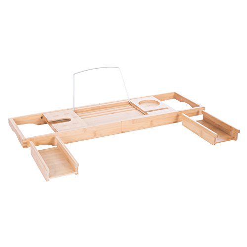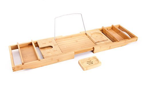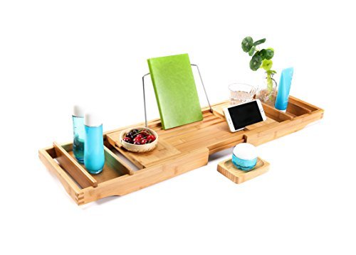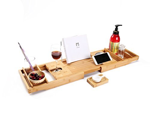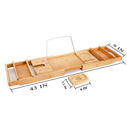 - THE BEST, COST EFFECTIVE WAY TO TRANSFORM YOUR BATHROOM: There is no better way to add some class and LUXURY in your bathroom than placing this bathtub tray over your tub. Adjustable bamboo bath caddy is suitable for any tub or Jacuzzi design (wide, oversized rectangle, round or narrow). 29 1/2" base could be adjusted up to 43" maximum. Unpack and use condition.