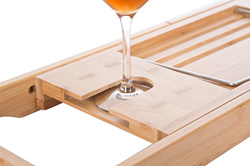 - STURDY, SAFE AND BUILT TO LAST: This unique bathtub caddy is made of the highest quality bamboo wood that is being used only by the most luxurious brands on the market. It is Eco-Friendly and incomparably durable as it is resistant to water and promises to provide super comfort for life. The sturdy design prevents the tray from sliding, bouncing or skidding across the tub like the normal metal tray does.
