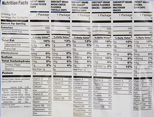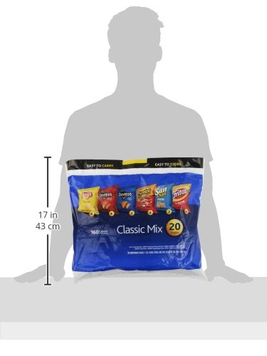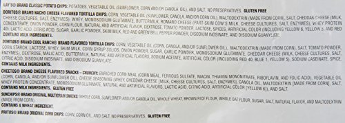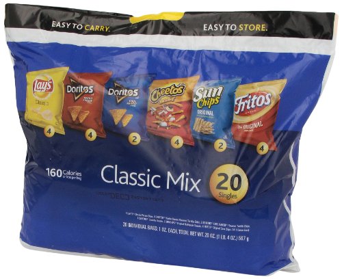 -. Feature : MAKE EVERY DAY A FUNDAY / 20 count variety pack: four 1.0 oz bags of FRITOS Original Corn Chips, LAY'S Classic Potato Chips, CHEETOS Crunchy Cheese Flavored Snacks, and DORITOS Nacho Cheese, & two 1.0 oz bags of DORITOS COOL RANCH Flavored Tortilla Chips and SUNCHIPS Original Multigrain Snacks / Variety pack of Frito-Lay favorites in one convenient package / Easy to purchase, easy to carry, easy to store / Single-serve packs help with portion control and portability and ensure fresh tasting chips every time
