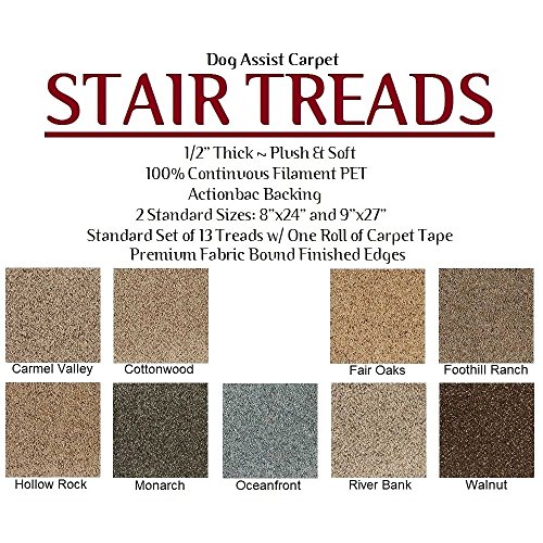 Studio : Koeckritz Rugs Publisher : Koeckritz Rugs Product Description 9 - Colors to choose from. Quality, Stylish Carpet Stair Treads extend the life of your high traffic hardwood stairs. Reduce slips/increase traction (your treads must be attached securely to your stairs). Great for pets and pet owners. Helps your dog easily navigate your slippery staircase. Set includes 13 carpet stair treads PLUS one roll of double-sided carpet tape for easy, do-it-yourself installation. Each tread is bound around the edges. You may remove your treads for cleaning and re-attach them when you are done. Add a fresh new look to your stairs today with new carpet stair treads. **Please Note colors may vary slightly in person due to flash photography and differences in monitor settings. Each rug/carpet is manufactured with the same colors as pictured; however they can be manufactured from slightly different "dye lots". Meaning when the yarn is dyed it can vary in shade ever so slightly. If you have any additional questions please contact our customer service department. 0
