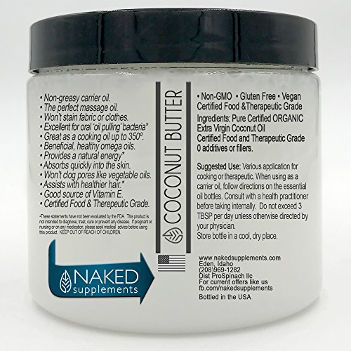 -. Binding : Grocery -. Brand : NakedOil -. Feature : Body: NakedOil Coconut Butter is an ideal moisturizer for the Skin and Hair. Packed with MCT's, NakedOil Coconut Butter can heal and strengthen Skin and Hair. / Food: NakedOil Coconut Butter can be used to cook with up to 350 degrees. Use it for sautéing or just in place of other fats for cooking! / Mouth: NakedOil Coconut Butter is great for Oil Pulling. Use in your mouth to pull and rid your body of harmful toxins. / Health: NakedOil Coconut Butter is loaded MCT's (Healthy Fats) that can help rid the body of less healthy fats. / DIY's: NakedOil Coconut Butter is Pure, Clean, Naked. Use it for all of your DIY's with confidence! -. IsAdultProduct : 0 -. Label : Naked Oil -. Manufacturer : Naked Oil -. PackageQuantity : 1 -. ProductGroup : Grocery -. ProductTypeName : GROCERY -. Publisher : Naked Oil -. Studio : Naked Oil -. Title : Coconut Butter-NakedOil 100% Coconut Oil, Organic Extra Virgin Unrefined Cold Pressed Coconut Oil. Certified Food and Therapeutic Grade