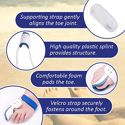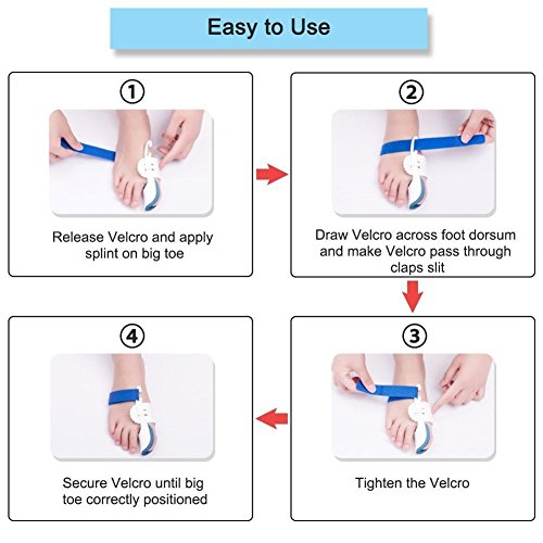 How to Use: - Use at night while sleeping or while resting your feet. - Release the velcro strap. - Insert your big toe into the foam sleeve so that the splint cradles your toe. - Wrap the velcro strap around the lateral side of your foot and loop it around the plastic slit. - Tighten the strap until it feels snug. Then fasten the velcro. - Wash with warm water and air dry. Clean regularly for optimal foot health.