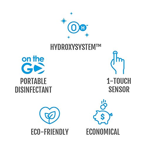 -. Feature : Powered by HydroxySystemTM technology, water molecules are instantly converted into hydroxyl ions, a powerful disinfectant agent that is highly reactive and equipped with robust surface disinfection capability / Eliminates more than 99.99% of pathogenic surface-bound germs in contact within just 30 seconds. / Designed with its 1-touch sensor, tap it once to activate the 30 seconds HydroxySystemTM process and the disinfecting properties from each activation can last up to 2 hours / 100% safe on skin, eyes, for ingestion and with no toxic chemical ingredients, you can readily disinfect common hot spots such as shared toys, keyboards or even lift buttons. / Requires 3 x AAA batteries (not included)
