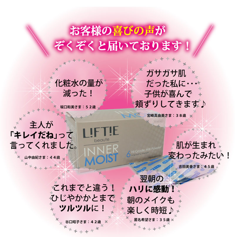 リフティボーテ「インナーモイスト」奇跡の6大配合バランスが年齢サインに即効アプローチ!しぼみ肌・たるみ肌・ブルドック顔になる前に!奇跡の6大配合バランスが”年齢サイン”に即効アプローチ!リフティーボーテ「インナーモイスト」