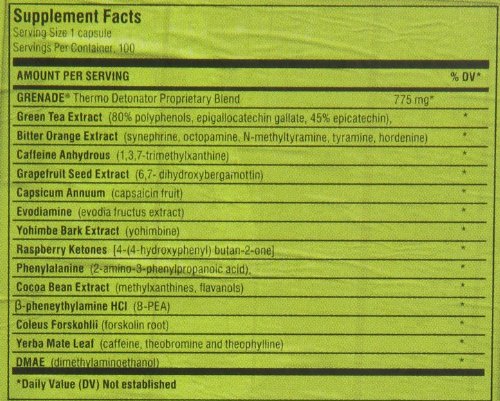 Green Tea Extract (80% polyphenols, 45% epigallocatechin gallate, epicatechin)Green tea, despite its modest name, contains certain active polyphenols that have been scientifically-demonstrated to have significant physiological effects, including fat loss, performance improvement and moderation of damaging cellular oxidation (antioxidant effects). Of particular interest is the catechin compound “epigallocatechin gallate”, which has been extensively investigated in several scientific studies and may be the most important legal, natural molecule in the war on fat! The specific green tea material used in Grenade Thermo Detonator has been manufactured to optimize levels of this compound.