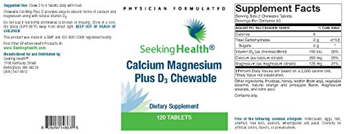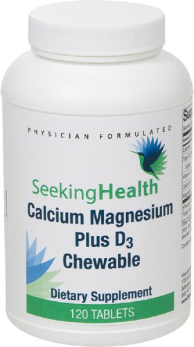 -. Binding : Health and Beauty -. Brand : Seeking Health -. EAN : 0828054148635 -. Feature : Calcium Magnesium Plus D3 Chewable provides bioavailable citrate forms of calcium and magnesium together with natural vitamin D in convenient chewable wafers. / Calcium and magnesium are essential minerals that work in concert with vitamin D to support healthy bone formation. / Calcium and vitamin D are needed for bone mineral density, while magnesium supports bone strength and remodeling. / Free of Inulin or FOS, Streptococcus, Casein, Dairy, Egg, Fish, Gluten, Peanuts, Shellfish, Tree Nuts, Wheat. -. Label : Seeking Health -. Manufacturer : Seeking Health -. MPN : 025-05-001-58 -. PackageQuantity : 1 -. PartNumber : 025-05-001-58 -. ProductGroup : Health and Beauty -. ProductTypeName : HEALTH_PERSONAL_CARE -. Publisher : Seeking Health -. Studio : Seeking Health -. Title : Calcium Magnesium Plus D3 | Best Bone Support Supplement | Calcium, Magnesium, Vitamin D and Other Nutrients Provided Per Dose | 120 Chewable Tablets | Free Of Common Allergens | Seeking Health -. UPC : 828054148635
