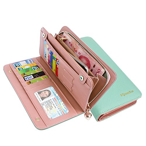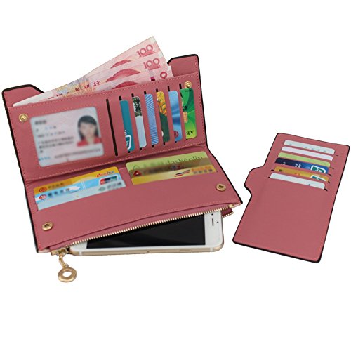 ✔INTERIOL:The women long wallet looks small but large capacity.There are total of 18 slots,2 ID card slots,1 large zipper compartment,3 medium sized compartments,1 removable credit card sleeve.