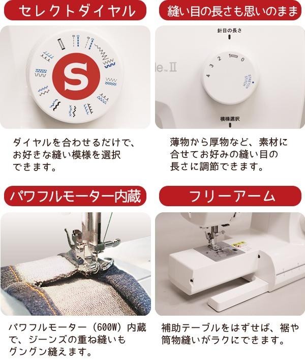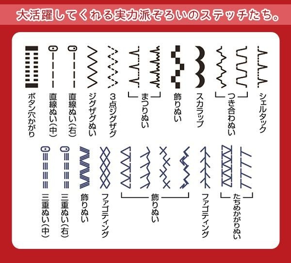 | 仕様 | 定格電圧:100V 50/60Hz 定格消費電力:60W 最大回転数:700~800rpm LEDランプ採用 水平全回転釜 縫い目長さ調節/最大長さ:あり最大4.5mm 縫い目幅調節/最大幅:ジグザグのみ最大5.0mm 模様表示種類:シルク印刷 模様数:21種類23模様 段縫い押さえ:なし ダイヤル数:2ダイヤル ボタンホール種類:1種類(半オート式・シャツ穴) 糸調子:マニュアル 自動針穴糸通し スタート・ストップボタン:フットコントローラー式 模様選択方式:ダイヤル回転 返し縫い:レバー式 ドロップフィールド:なし 面板糸切り:あり コード長/本体差し込みプラグ~フットコントローラー:123cm、本体差し込みプラグ~電源プラグ:185cm |