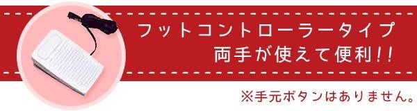 | 両手が自由に使えるフットコントローラータイプ。筒物縫いもラクラクできるフリーアーム。ジーンズの重ね縫いもグングン縫える!パワフルモーター(60W)内蔵。 |