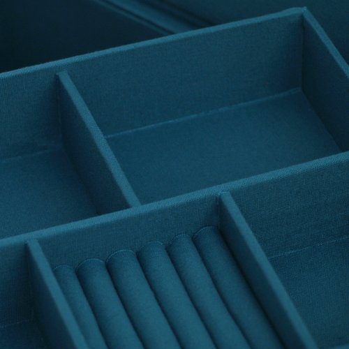 - Feature : White pebble textured leatherette exterior with turquoise fabric interior / Dimensions: 14"w x 10.5"d x 5.5"h / Features a seven compartment lift out tray / Large open storage below tray / Snap closure lid