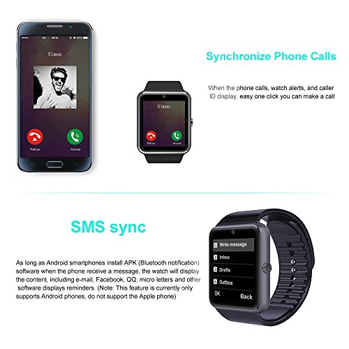 Note:All functions are available for Andorid Smartphone.But for IOS phones,Some functions can not be used,Please see the description carefullly,it does not support SMS synchronization FAQ What's the difference between putting into micro SIM card and connecting Bluetooth? If you put into a SIM card,the watch can be used as a standalone smartphone on your wrist,like making calls,receiving or sending texts.Through Bluetooth,you can not receive or reply texts.Other functions are all the same.