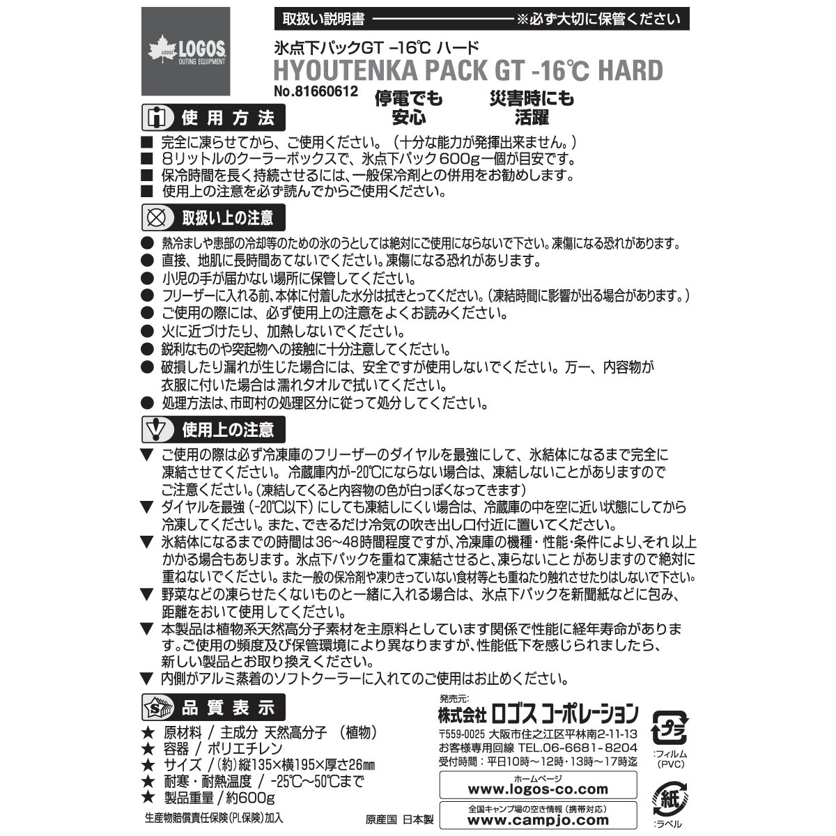 Surface temperature -16 ° C. Cooling capacity 8 times (Compared with general refrigerant) Strong refrigerant for log frozen fish It can be kept cold for a long time only with use of regular refrigerant Contents are safe vegetable